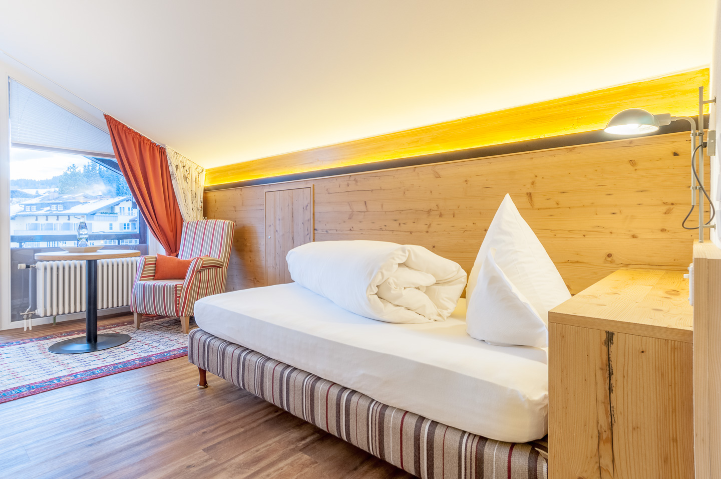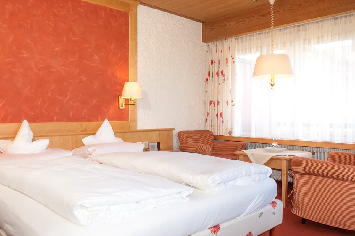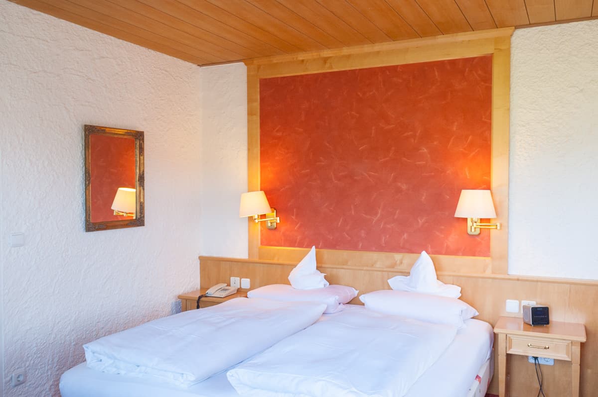 Das ist das preiswerte Doppelzimmer im Kurhotel Hochbühl, mit Platz für zwei, einem Ostbalkon für alle, die den Sonnenaufgang lieben und der hoc